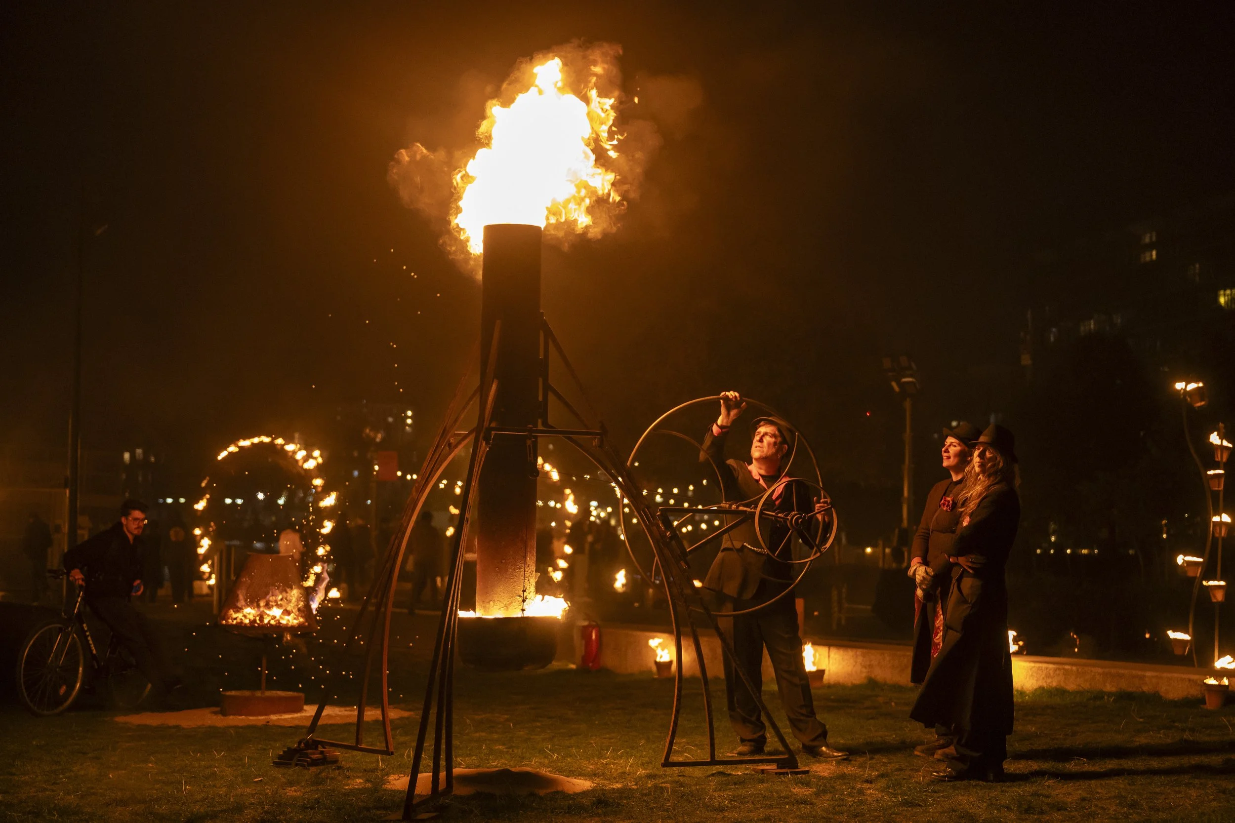 Josephine Burton and Cristina Catalina were Associate Directors on Rekindling, leading on soundscape and music as part of Dash Arts’ contribution to this large-scale public artwork at the Royal Docks. Rekindling was an ambitious fire installation by Compagnie Carabosse, created with Royal Docks communities, weaving together stories of place, migration, resistance and future hopes. Burton worked with sound artists James Wilkie and Marie Horner to create an immersive audio soundscape drawn from oral testimonies from people who live and work in the Royal Docks and elemental sound. The soundscape, Earth, Air, Fire and Water, was experienced as a standalone audio journey and site specifically across the site. Catalina worked with international and local MDS to present 14 local musicians on stages across the installation.